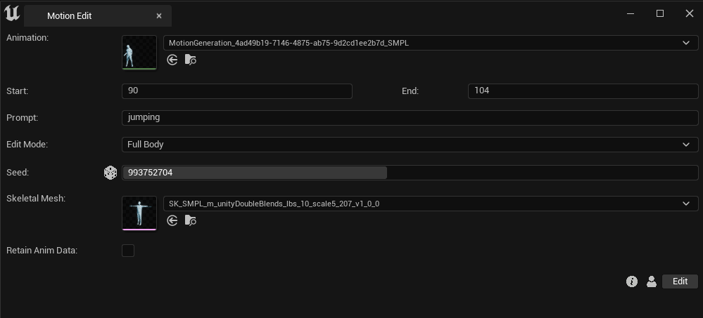 Modify existing animations with the “Motion Edit” tool. Select the animation to be edited via the input field or by dragging and dropping an “Animation sequence” .uasset from the UE Editor Content Browser.